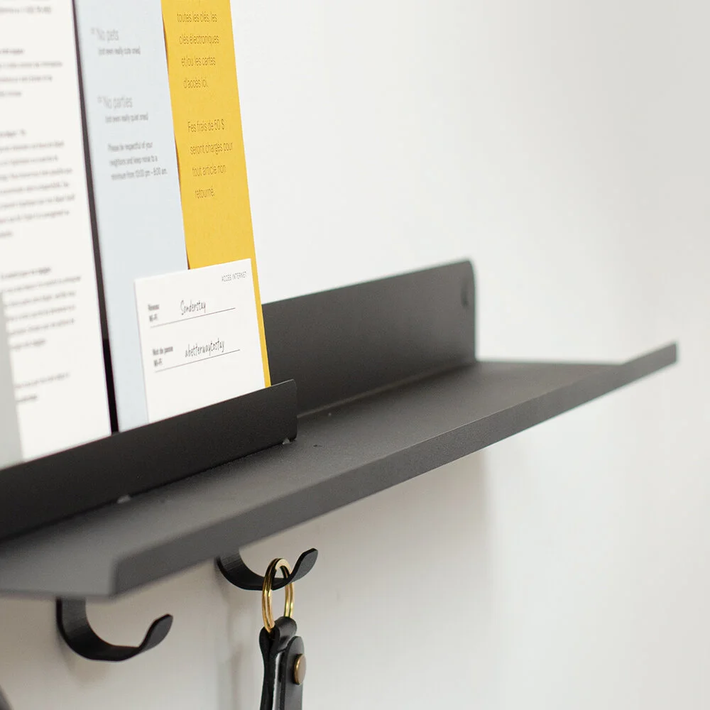 The shelf featured featured a slotted card holder set at a distance to create a specific angle for ease of read, a shelf space for room keys, and hooks for umbrellas and coats.